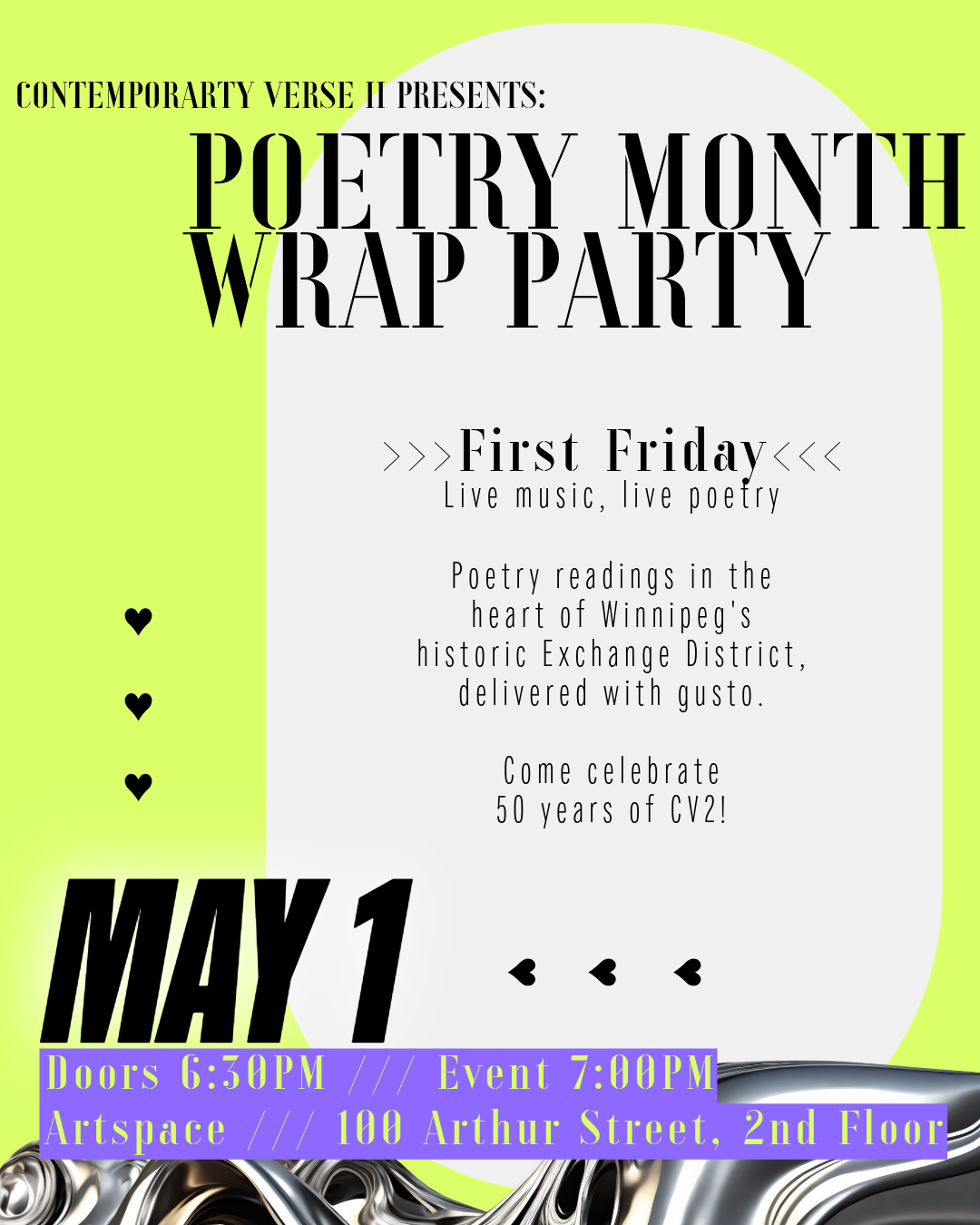 This event, occurring during the lively First Fridays in the Exchange, also marks the end of National Poetry Month. We’re so happy to be joined by some of the wonderful Winnipeg-based contributors whose work appeared in CV2 this past year! We’ll have readings by J.R. Léveillé, Catherine Hunter, Sarah Klassen, Jaime Black-Morsette, Sarah Ens, Van Osborne Zimrose, Shawna Dempsey, and George Amabile, as well as live music from Theresa Thor!