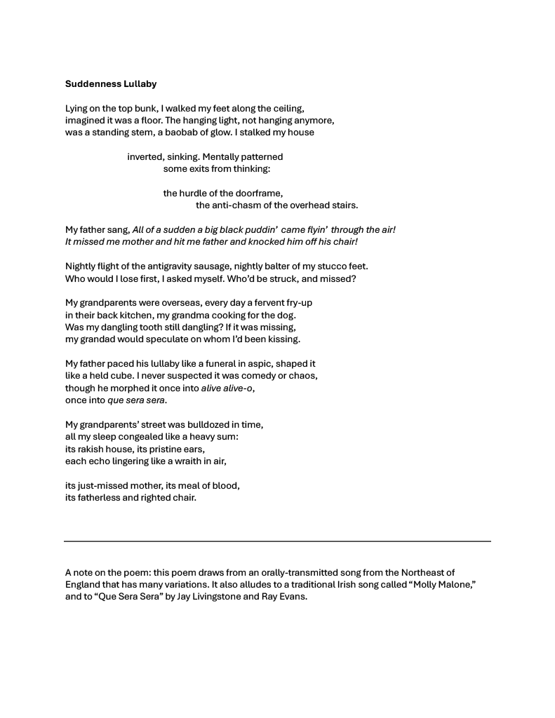 by Medrie Purdham Suddenness Lullaby This poem won the second 2026 Mini Contest, a warmup round for the 2-Day Contest! Published online March 27, 2026