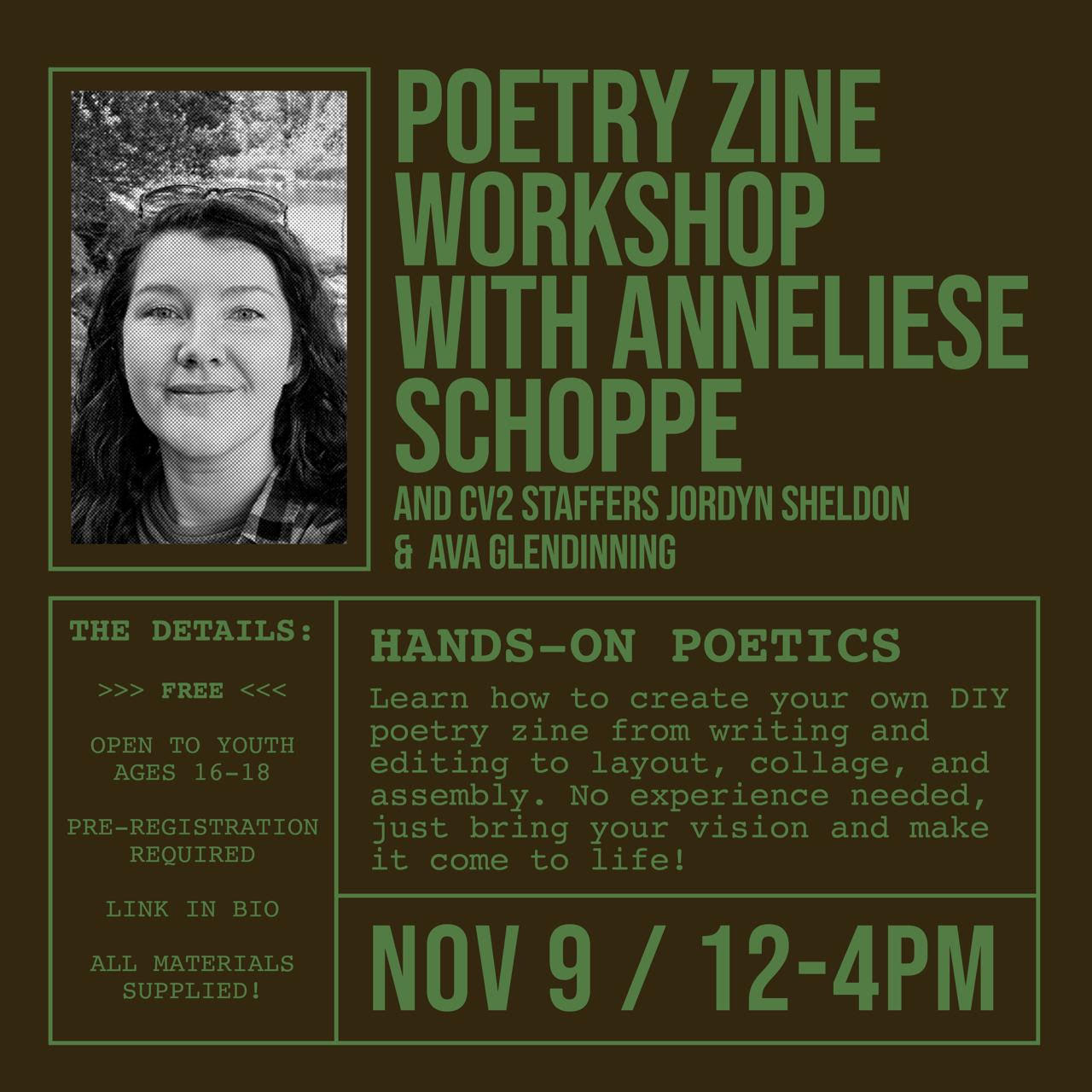 Open to youth in Winnipeg ages 16 to 18, this free, in-person zine-making workshop will be facilitated by Anneliese Schoppe and CV2 staff members. Exploring themes of community and place, participants will discuss contemporary Canadian poetry using examples from past issues of CV2 and then create their own zines via writing and collage.